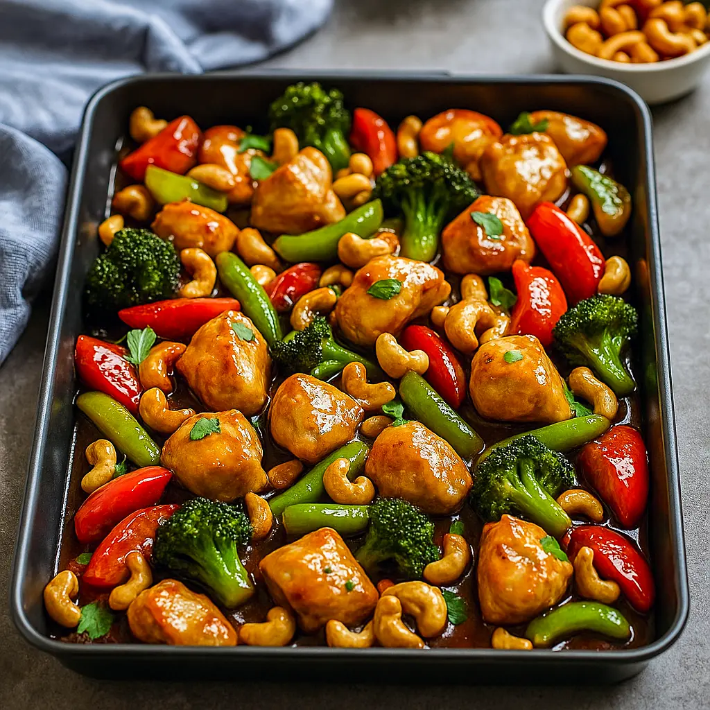 Simple, one-pan dinner: tender chicken, colorful peppers and onions, a sticky-sweet soy glaze, and crunchy cashews roasted right on the baking sheet. Ready in about an hour total with only ~15 minutes active work.